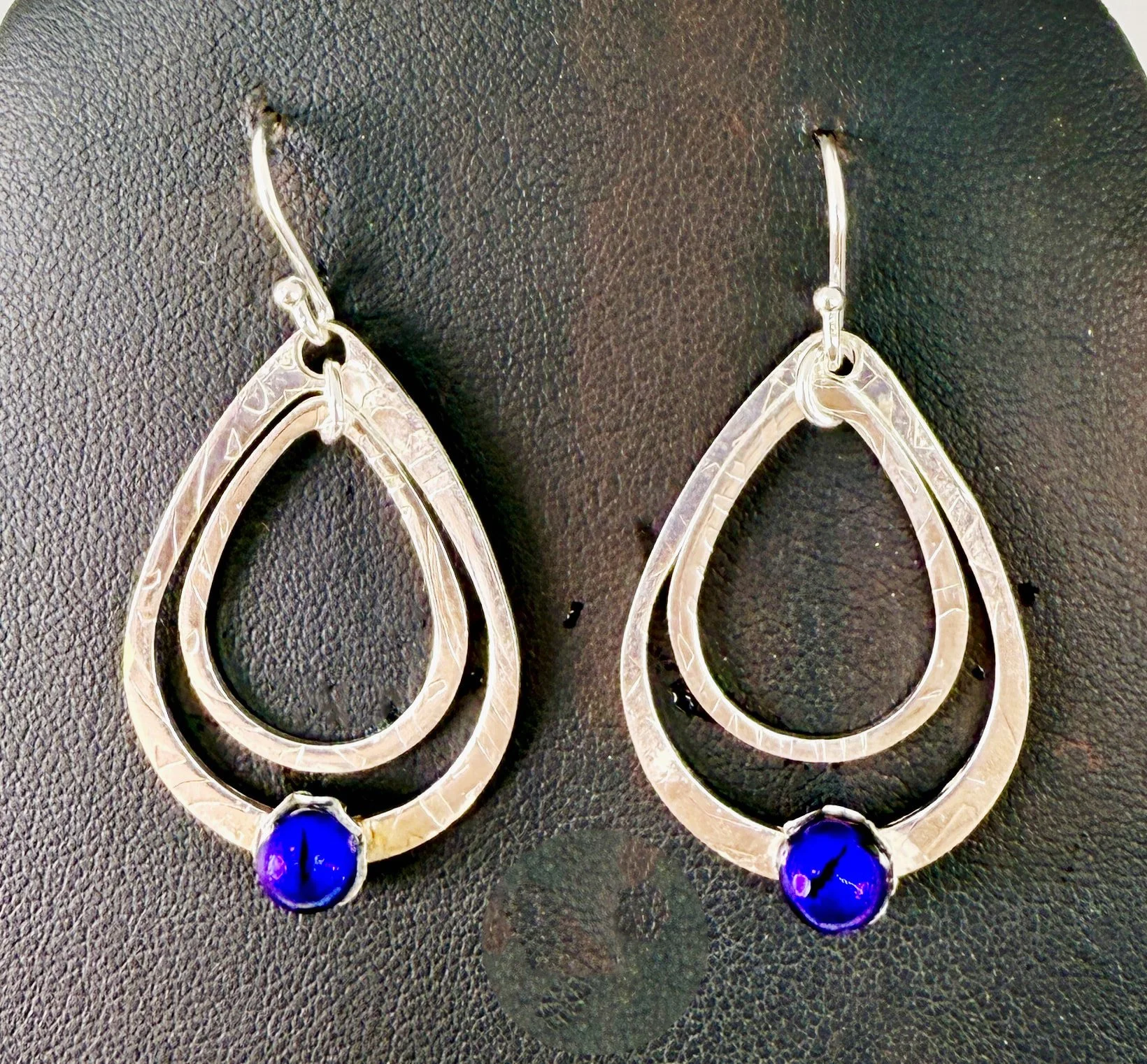 These playful earrings have movement between the two silver teardrops, one of which has a bright blue dot. Argentium Sterling silver is tarnish resistant and hypo-allergenic. 1 1/4" long, 3/4" wide.